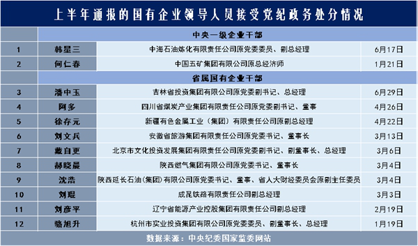上半年通报的国有企业领导人员接受审查调查情况 李灵娜制图